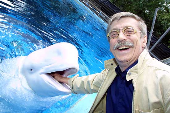 Weißwal “Ferdinand” lässt sich genüsslich von Zoodirektor Reinhard Frese den Rachen kraulen. Ferdinand und sein Walarium-Gefährte Jacobita-Delphin “Yogi” wurden in die USA umgesiedelt. Dem Duisburger Zoo fehlte das nötige Geld, um das nautische Gehege zukunftssicher und walgerecht umbauen zu können. Details entnehmen Sie bitte dem Bericht von Michael Minholz in der NRZ vom 03. September 2003.